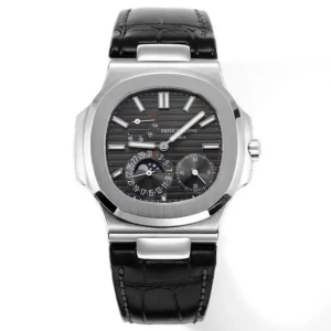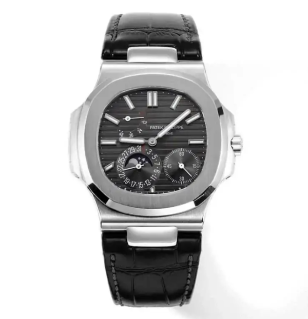 The Patek Philippe Nautilus 5712G-001 Black Leather Strap Replica watch, presented on a sleek black leather strap, exudes refined elegance. With its iconic Nautilus design and 40mm case, this watch seamlessly blends classic aesthetics with modern allure, making it a coveted accessory for the discerning man.