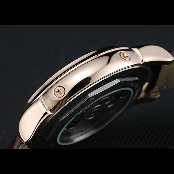 Bracelet: Brown leather strap with heat embossed Patek Philippe stamp and rose-gold plated hook-buckle clasp with Patek Philippe engraving