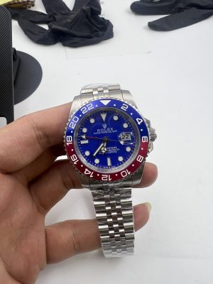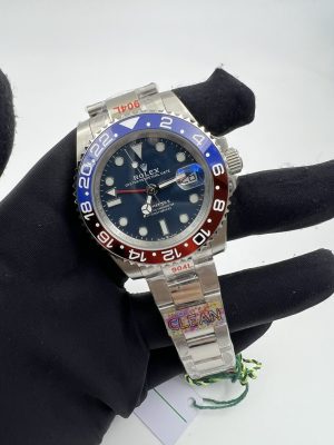 | Bezel: | 18k white gold bidirectional rotating 24-hour graduated blue and red Pepsi bezel. |