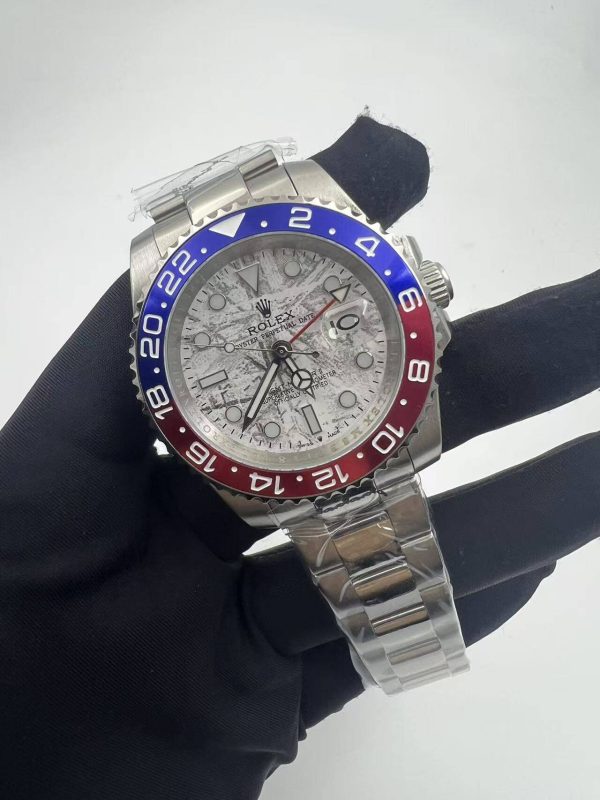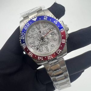 This watch, with a 40mm case, perfectly balances style and comfort. Its striking dial is crafted from genuine meteorite, each piece displaying a unique star pattern, ensuring each watch is unique. This rare dial is complemented by the Pepsi bezel—a vibrant blue and red colorway that pays homage to the classic aesthetic of the GMT collection. Beyond its visual appeal, this bezel also offers practical functionality, allowing the wearer to easily track multiple time zones, making it an invaluable tool for travelers and professionals.