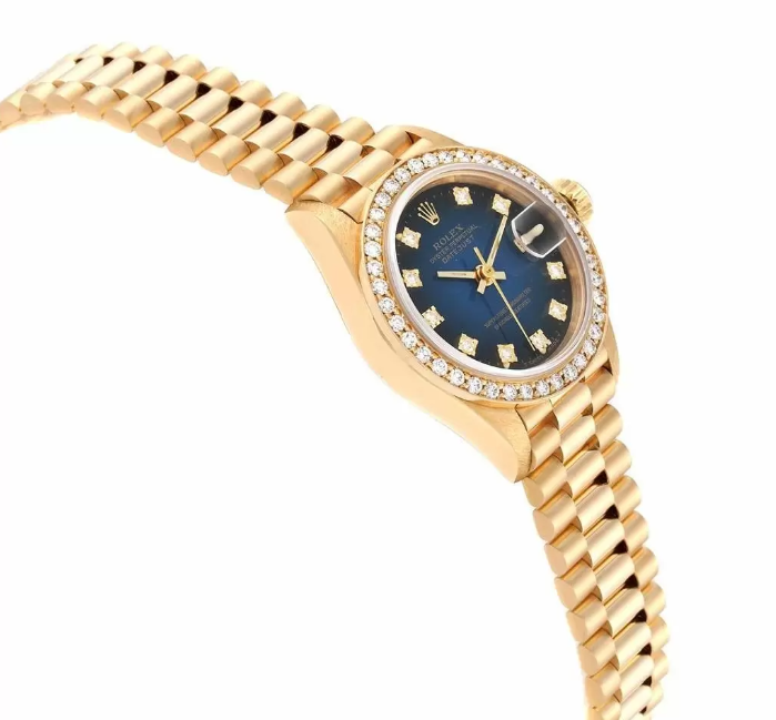 Elevating its brilliance, the bezel is masterfully set with a continuous circle of dazzling diamonds, each carefully selected and placed by Rolex artisans. This radiant frame introduces the true centerpiece of the watch: a captivating blue vignette dial. The dial’s artistry is revealed in its stunning gradient, where the color deepens from a soft, luminous center to a rich, profound azure at the edges, creating a mesmerizing sky-at-dusk effect. This exquisite canvas is further adorned with original Rolex factory diamond hour markers, each sparkling stone set into elegant yellow gold settings, ensuring legibility and extraordinary beauty. The practical functionality is seamlessly integrated with a date calendar, displayed through a signature Cyclops lens at the 3 o’clock position.